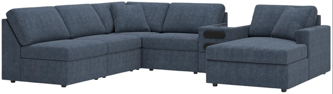 Comprend 6 éléments modulaires : méridienne d'angle avec accoudoir à droite, 3 fauteuils sans accoudoirs, coin et console audio avec rangement.