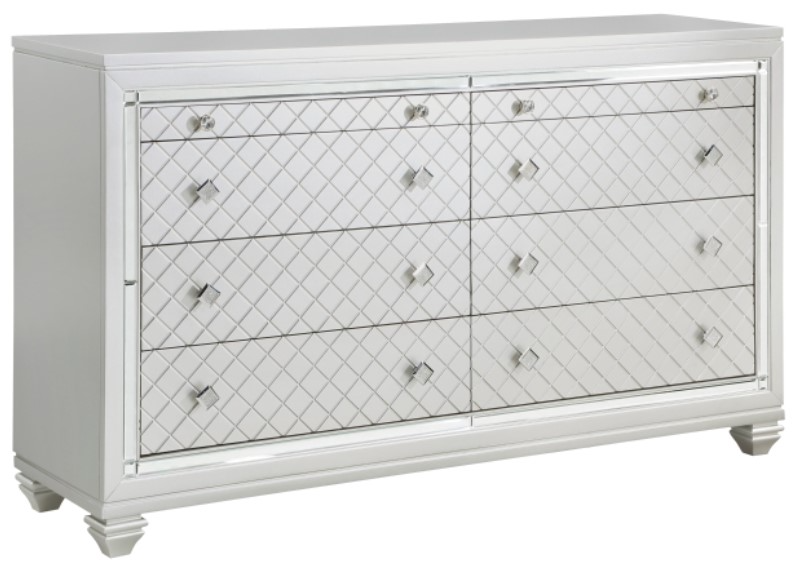 La présentation visuelle audacieuse de la collection Leesa complète vos aspirations de design glamour. Les façades de tiroirs et la quincaillerie à motif de diamant, ainsi que l'encadrement en miroir, sont mis en valeur sur la commode au fini argenté, dont le style classique confère un accent intemporel à l'aspect de la collection.Read More